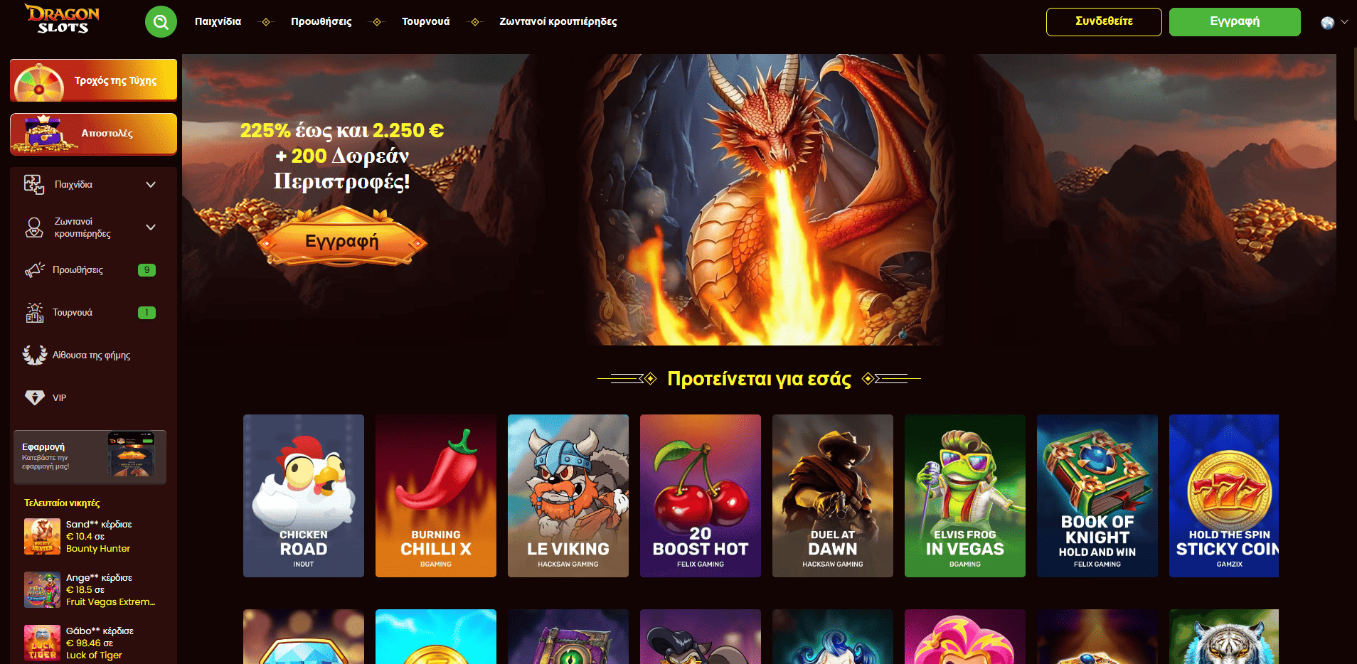 Με δραστηριότητα από το 2023, η πλατφόρμα DragonSlots έχει κάνει το όνομά της χάρη στην εξαιρετική ταχύτητα συναλλαγών και την τεράστια βιβλιοθήκη slots. Διαθέτει άδεια από το Estonian Tax and Customs Board και προσφέρει instant withdrawals για Bitcoin και Ethereum, με processing time μόλις 10-20 λεπτά. Η πλατφόρμα διαθέτει 2.800 συν slots, περιλαμβάνοντας hits όπως Book of Dead από Play'n GO, Gates of Olympus και Sweet Bonanza από Pragmatic Play. Ενώ το Gransino περιορίζει τις αναλήψεις στα 5.000 EUR ανά εβδομάδα, εδώ επιτρέπονται έως 20.000 EUR χωρίς KYC.
